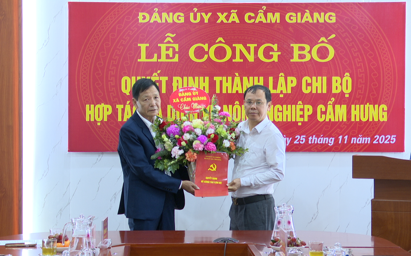 Sáng ngày 25/11, Ban Thường vụ Đảng ủy xã Cẩm Giàng tổ chức Lễ công bố Quyết định thành lập Chi bộ Hợp tác xã Dịch vụ Nông nghiệp Cẩm Hưng. Tới dự và chỉ đạo có đồng chí Nguyễn Văn Công, Bí thư Đảng ủy, Chủ tịch HĐND xã, đồng chí Nguyễn Văn Dũng, Phó Bí thư Thường trực Đảng ủy, đồng chí Nguyễn Quang Sáng, Phó Bí thư Đảng ủy, Chủ tịch UBND xã.