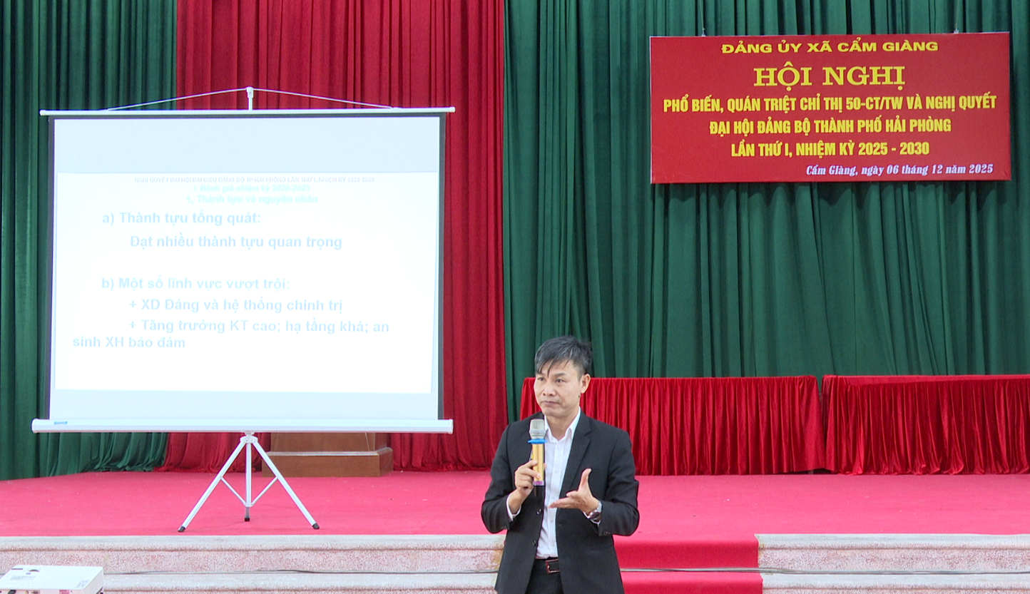 Sáng ngày 6/12, Đảng ủy xã Cẩm Giàng tổ chức hội nghị phổ biến, quán triệt Nghị quyết Đại hội Đảng bộ thành phố Hải Phòng lần thứ I, nhiệm kỳ 2025 – 2030 và Chỉ thị 50 ngày 23/7/2025 của Ban Bí thư về tiếp tục đổi mới và nâng cao chất lượng sinh hoạt chi bộ trong giai đoạn mới.