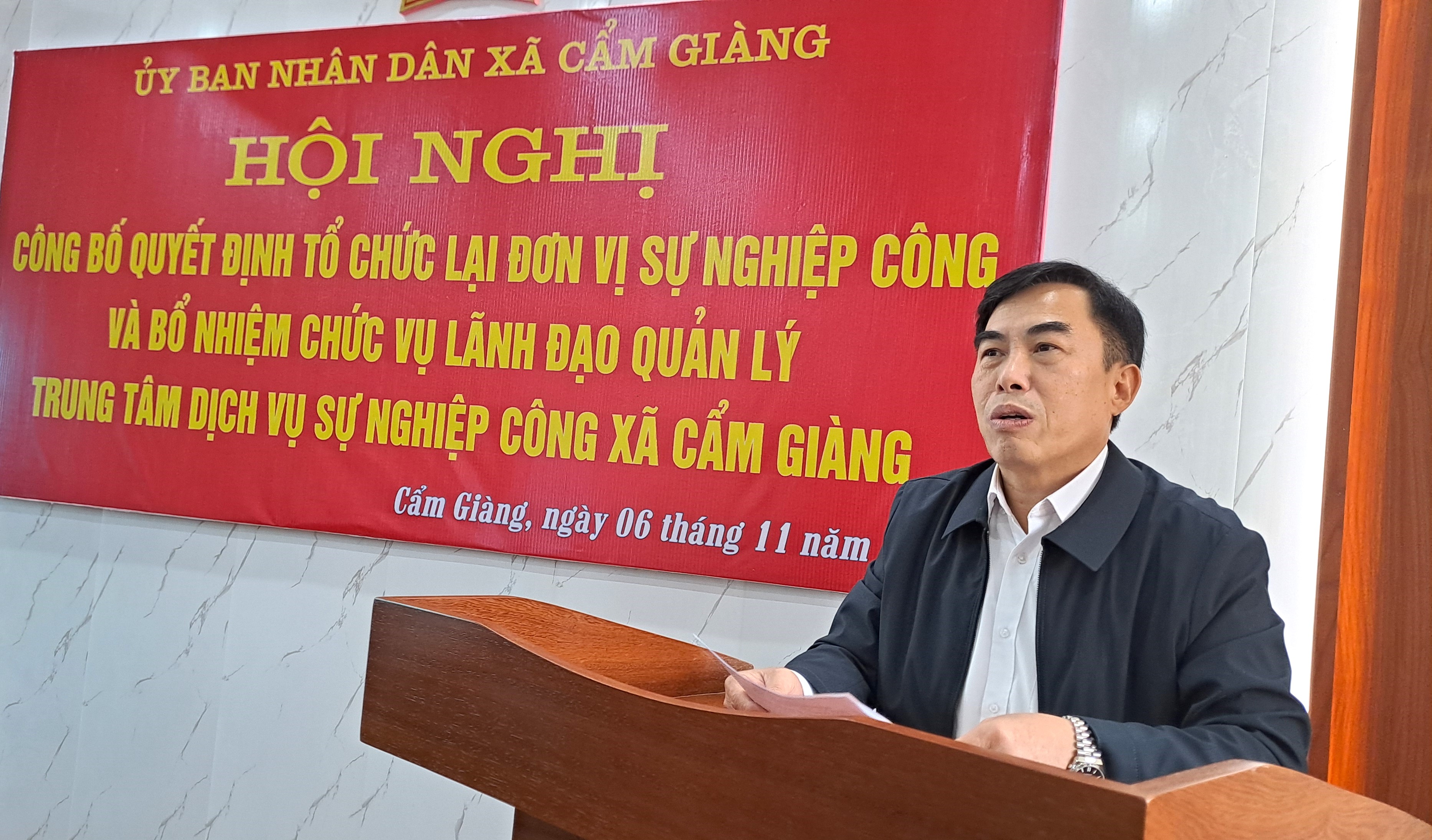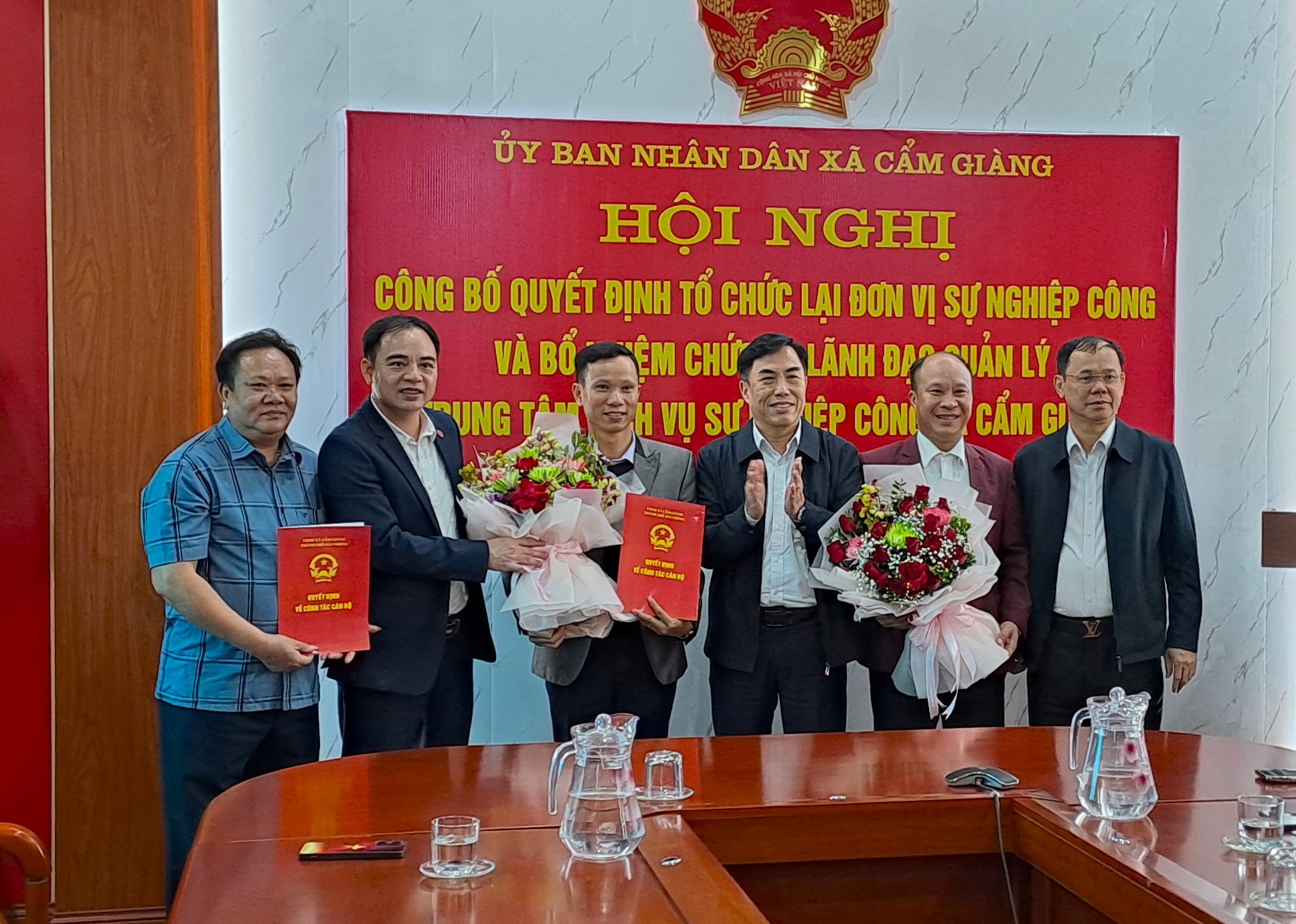 Tại buổi lễ, lãnh đạo phòng Văn hóa Xã hội xã Cẩm Giàng đã công bố Quyết định của UBND xã về việc tổ chức lại Trung tâm Văn hóa, Thể thao và Truyền thông xã Cẩm Giàng đổi tên thành Trung tâm Dịch vụ sự nghiệp công xã Cẩm Giàng trực thuộc UBND xã kể từ ngày 01/11/2025. Quyết định bổ nhiệm ông Phạm Tuấn Sỹ, Phó Giám đốc Trung tâm Văn hóa, Thể thao và Truyền thông xã giữ chức Phó Giám đốc Trung tâm Dịch vụ sự nghiệp công xã Cẩm Giàng, thời gian giữ chức vụ là 5 năm, kể từ ngày 01/11/2025.