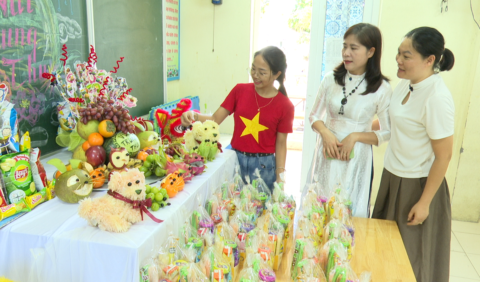 Trước đó, tại mỗi lớp học, các em học sinh cùng các thầy cô giáo và phụ huynh học sinh đã cùng nhau bày, trang trí những mâm cỗ Trung thu với nhiều màu sắc bắt mắt và ý nghĩa, mang đậm nét cổ truyền của dân tộc.